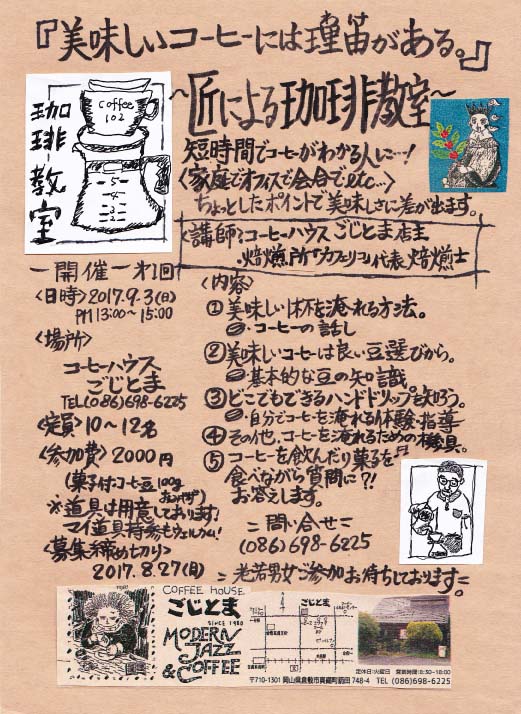| 第2回珈琲教室 2017年11月19日(日) 13:00〜15:00 定員に達しましたため募集を締め切りました。 ごじとま ページにて情報を発信します。〈第1回珈琲教室 2017年09月03日(日)〉 ![]() ![]() 〈第2回珈琲教室 2017年11月19日(日)〉