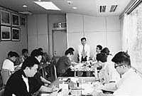 「東粟倉村商工業協同組合の視察研修」この協同組合は青年部員が出資して協同組合を作り,村が建設したベルピール自然公園とベルピールホールの管理運営を共同組合が委託を受けて運営している。しかしこのベルピールホールの管理運営だけでは経営が厳しいので閉館される冬場の労働力を活かしたチョコレートやクッキーなどを自分達の手で作って販売している。このように過疎の村の青年部員が力を合わせて協同事業を行うことで地域振興に新しい風を吹き込んでいる事を,研修しました。 |